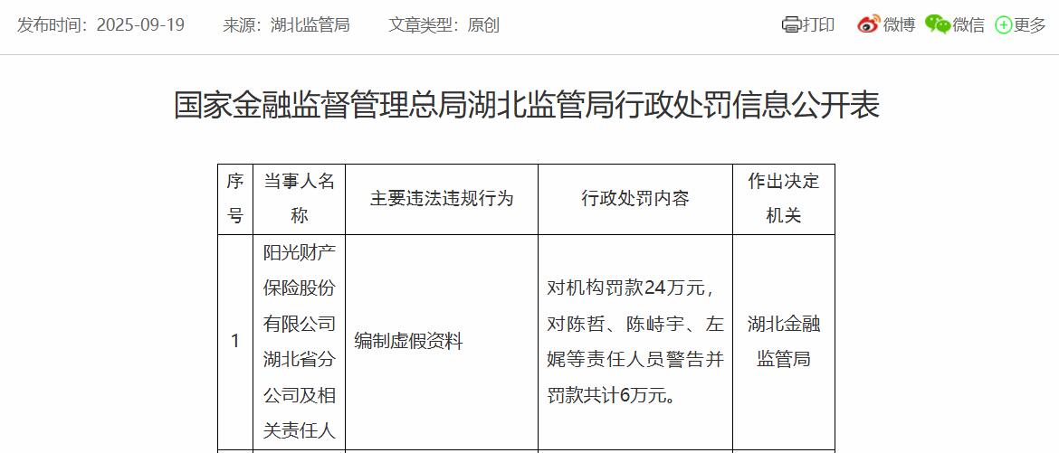 中国经济网络北京,9月22日,国家政府政府管理局的财务监督和管理网站的形式显示,Sunshine Property Insurance Co,Ltd。的湖北部分支机构(定义为“ Sunshine Property Insurance Hubei Branch”)以及负责人 - 负责人已经准备了虚假信息。 Hubei金融监管局对阳光财产保险分支机构进行了240,000元的惩罚,警告Chen Zhe,Chen Zhiyu,Zuo Wei和其他负责人和其他负责人,并惩罚了总共60,000元人民币。以下是原始文本: